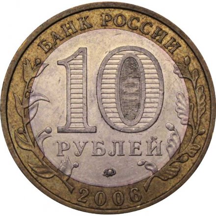 Аверс: сверху вдоль края монеты слова «БАНК РОССИИ», внизу год чеканки «2006», слева ветка оливы, справа дуба, обе ветки частично заходят на центральную вставку. В середине номинал «10» под ним слово «РУБЛЕЙ», внутри цифры «0» попеременно видимые при наклоне монеты надписи «10» и «РУБ». Над годом монограмма монетного двора «ММД».