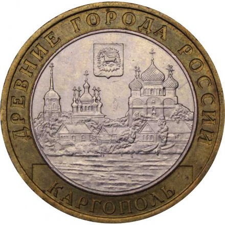Реверс: изображение панорамы города на берегу реки, выше – герб города Каргополя, по окружности – надписи: вверху – «ДРЕВНИЕ ГОРОДА РОССИИ», внизу – «КАРГОПОЛЬ».