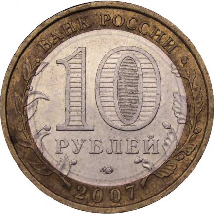 Аверс: сверху вдоль края монеты слова «БАНК РОССИИ», внизу год чеканки «2007», слева ветка оливы, справа дуба, обе ветки частично заходят на центральную вставку. В середине номинал «10» под ним слово «РУБЛЕЙ», внутри цифры «0» попеременно видимые при наклоне монеты надписи «10» и «РУБ». Над годом монограмма монетного двора «ММД».