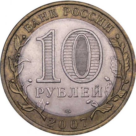 Аверс: сверху вдоль края монеты слова «БАНК РОССИИ», внизу год чеканки «2007», слева ветка оливы, справа дуба, обе ветки частично заходят на центральную вставку. В середине номинал «10» под ним слово «РУБЛЕЙ», внутри цифры «0» попеременно видимые при наклоне монеты надписи «10» и «РУБ». Над годом монограмма монетного двора «ММД».