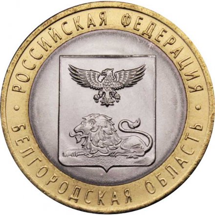 Аверс: На диске расположено изображение герба Белгородской области, на кольце по окружности имеются надписи: в верхней части — «РОССИЙСКАЯ ФЕДЕРАЦИЯ», в нижней части — «БЕЛГОРОДСКАЯ ОБЛАСТЬ».