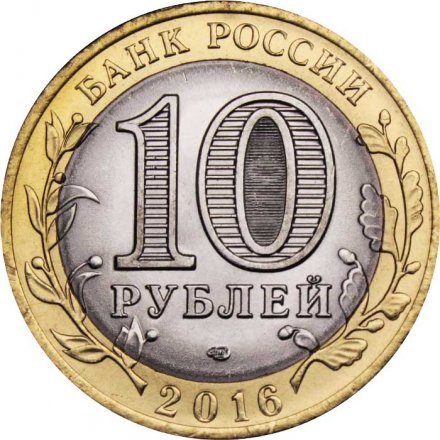 Реверс: В верхней части — «БАНК РОССИИ», в нижней части — «2016». Слева и справа на внешнем кольце расположены изображения ветви лавра и дуба соответственно, элементы изображения которых переходят на диск. В центре диска расположены число «10» и надпись «РУБЛЕЙ» под ним, обозначающие номинал монеты. Внутри цифры «0» имеется защитный элемент в виде числа «10» и надписи «РУБ», наблюдаемых под разными углами зрения к плоскости монеты. В нижней части диска расположен товарный знак монетного двора.