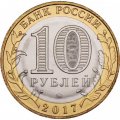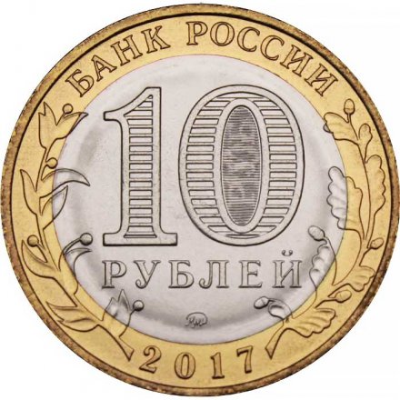 Реверс: В верхней части — «БАНК РОССИИ», в нижней части — «2017». Слева и справа на внешнем кольце расположены изображения ветви лавра и дуба соответственно, элементы изображения которых переходят на диск. В центре диска расположены число «10» и надпись «РУБЛЕЙ» под ним, обозначающие номинал монеты. Внутри цифры «0» имеется защитный элемент в виде числа «10» и надписи «РУБ», наблюдаемых под разными углами зрения к плоскости монеты. В нижней части диска расположен товарный знак монетного двора.