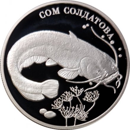 рельефное изображение сома Солдатова, перед ним – куст водоросли, справа вверху вдоль канта – надпись: "СОМ СОЛДАТОВА".